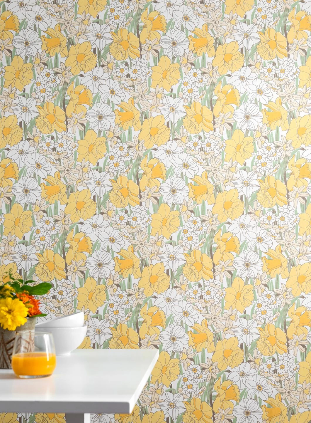 Saftiges Hellgelb dominiert bei dieser surrealistisch angehauchten Blumentapete. Die ausgefallene Designtapete erhellt Vintage-Looks mit weißer Note und lässt Hippie-Feeling neu aufkommen. Die waschbeständige Vliestapete fördert Geselligkeit und ist in Räumen wie Küche und Esszimmer goldrichtig angebracht.