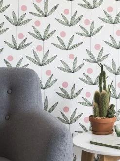 Zierliche stilisierte Palmenblätter in einem hellen Blassgrün scheinen an ihren Stielen zu tanzen. Aufgelockert wird das minimalistische Design durch die rosafarbenen Punkte, die sich mit den Blättern abwechseln und die weiße Fläche mit Leben erfüllen. Ein Hauch von Nostalgie umweht die Vliestapete, die sich ebenso schön für Vintage-Einrichtungen wie für eine Ausstattung im skandinavischen Stil eignet.