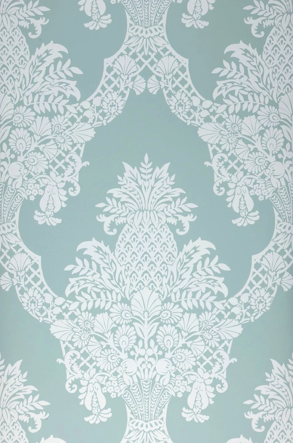 Wie das eingewebte Muster einer feinen Damasttischdecke sieht das weiße Barockmuster auf dem hellen, pastelltürkisfarbenen Untergrund aus. Die aufwändigen Arrangements aus Ananasfrüchten, Blüten und Blattranken, verbunden durch geschwungene Gittermuster, behalten durch die helle Farbwahl eine ganz unbarocke Leichtigkeit und verschönern Ihr Wohn- oder Esszimmer mit klassischen oder modernen Möbeln auf edle, aber dezente Weise.