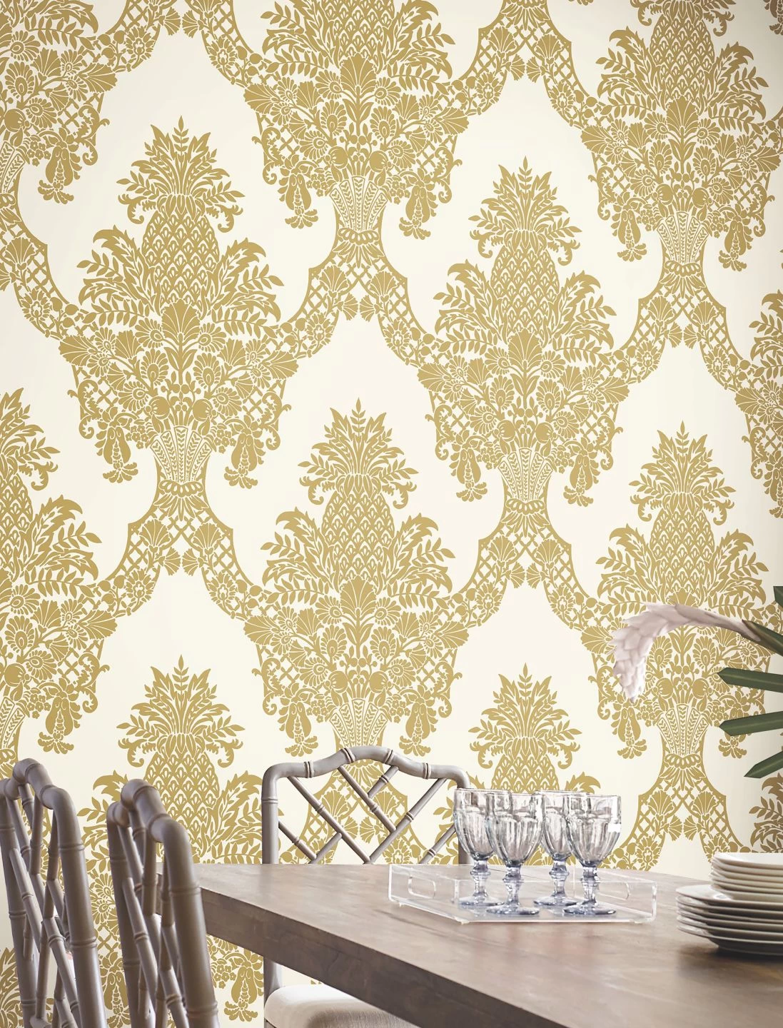 Das barocke Muster aus Ananas, Blüten- und Blattornamenten ist ganz in schimmerndem Perlgold auf mattem weißem Grund gehalten und lässt Ihr Esszimmer wirken wie ein Speisesaal in einem Schloss. Scherenschnittartig fügen sich die filigranen Blumenornamente, die durch geschwungene Gittermuster verbunden sind, zu einer edlen Komposition zusammen. Mit der Papiertapete Pineapple Damask fügen Sie Ihren Räumen ein wenig Luxus hinzu.