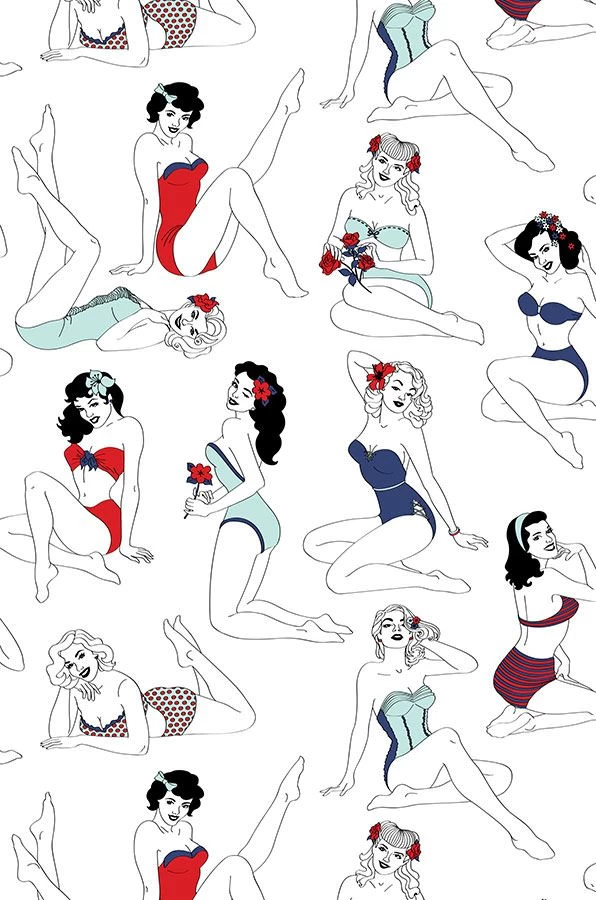 Man nehme einen herrlichen Sommertag in Florida Beach sowie sexy Pin-up Girls mit scharfen Kurven und ordne sie in reizvollen Posen und mit Understatement-Farben zu einem tanzenden Muster an – Fertig ist das Dupenny-Meisterstück für Wohndesign mit nostalgisch stimmungsvoller Strandatmosphäre, die rassige Schönheit ausstrahlt.