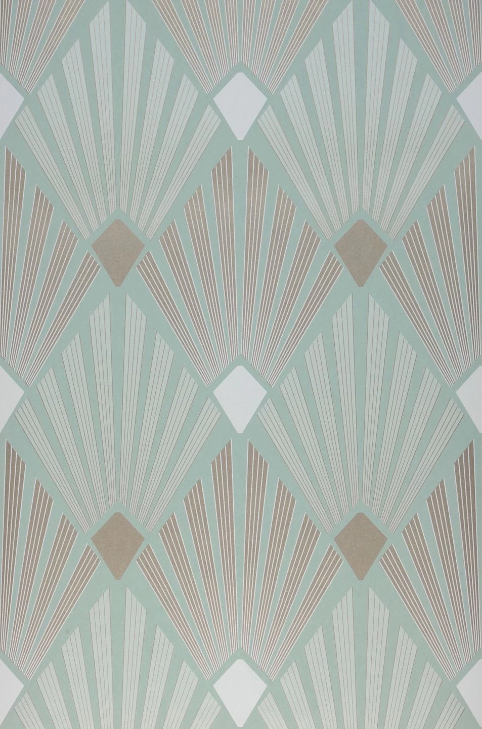 Aus dem ausgeklügelten Zusammenspiel von Farbe und Form entsteht ein Design ganz im Stil des Art Deco. Sich verbreiternde Streifen gehen wie Strahlen von rautenförmigen Zentren aus und setzen sich zu einem klaren, geradlinigen Muster aus großen Fächern zusammen, das eine mitreißende Dynamik entwickelt. Graubeige und Pastelltürkis unterstreichen den unwiderstehlichen nostalgischen Charme der Tapete.