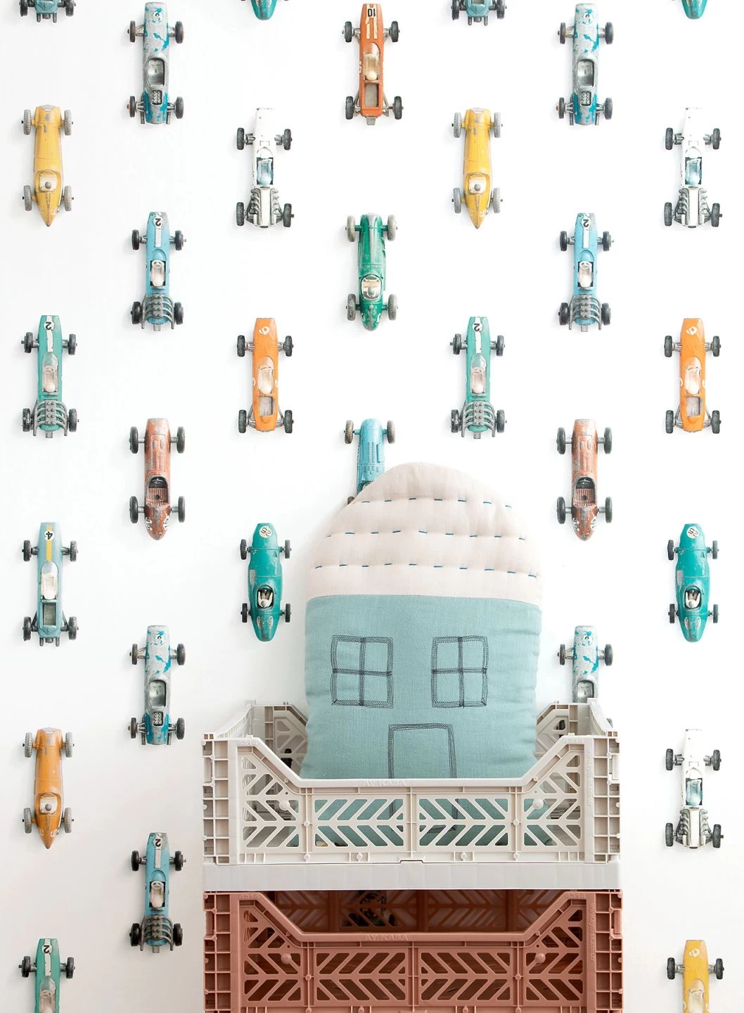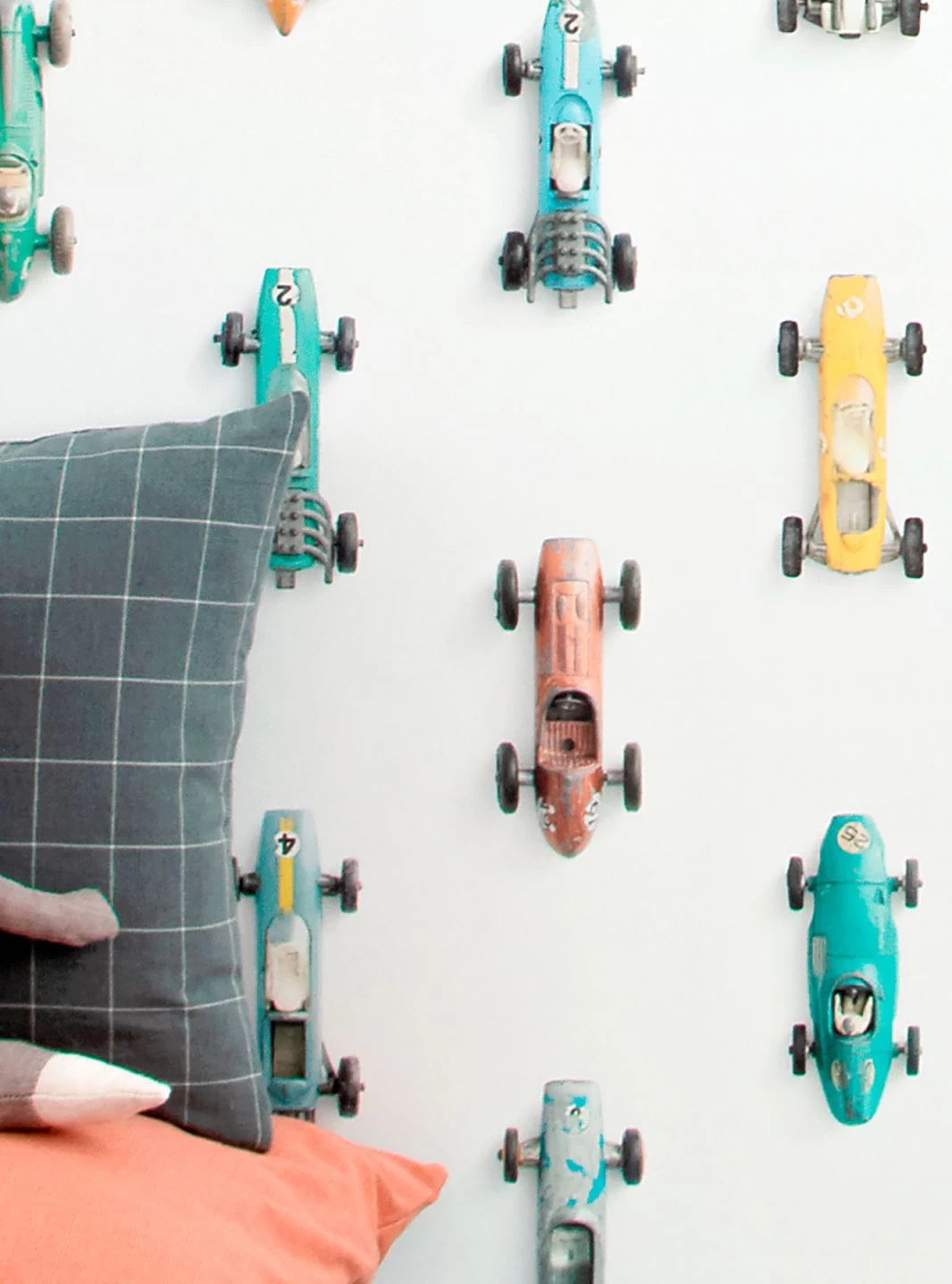Da fahren sie auf der Wand entlang, die flotten Flitzer aus den Anfängen des Rennsports. Die nostalgischen Rennwagen wirken in der Tat wie aufgesetzte Spielzeugautos, die nur noch auf den Startschuss warten. Es könnte auch eine wertvolle Sammlung sein, die durch den weißen Hintergrund perfekt zur Geltung kommt. Die Mustertapete von Studio Ditte bietet Raum für zahlreiche Interpretationen und Aktionen.