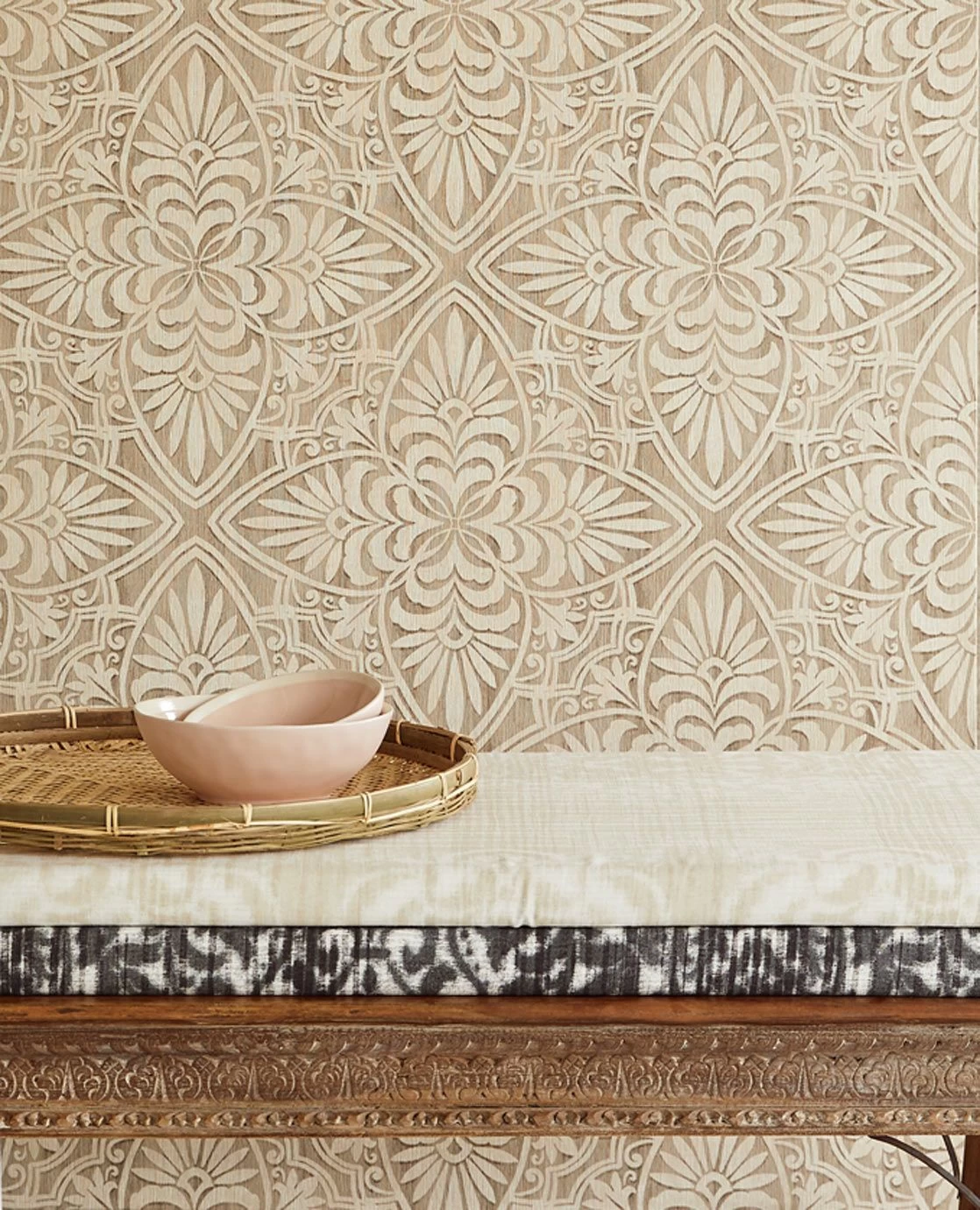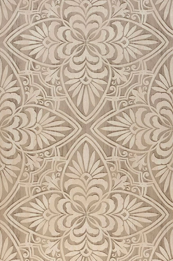 Orientalische Schnitzereien wie sie auf Wandvertäfelungen, Fensterläden und schmückendem Mobiliar zu finden sind, glänzen hier musterhaft und mit fühlbarer Struktur an der Wand. Die natürliche Farbgebung der robusten Vinyl Tapete erlaubt eine Vielzahl an Gestaltungsideen – von Shabby und Vintage Chic bis hin zu puristischen Asia-Styles.