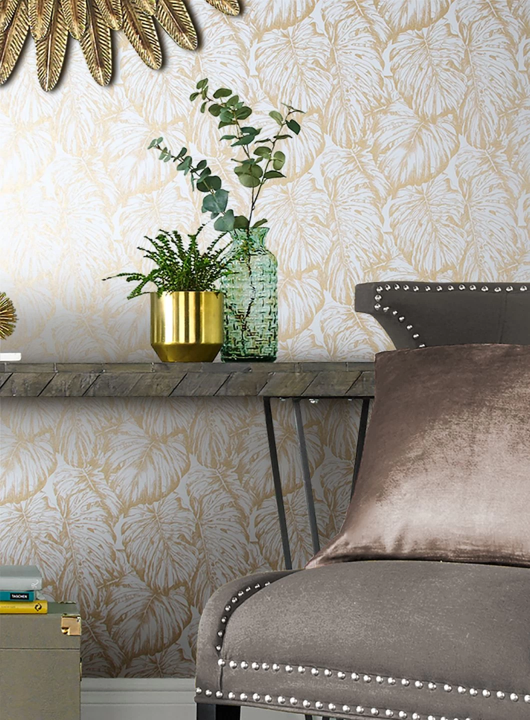 Ein Königreich für dieses Blattwerk, das sich in goldenem Glanz über den cremeweißen Grundton legt. Die ineinander übergehenden Blätter stehen für Fülle, z.B. die Fülle des Lebens, die Fülle des Lichts oder die Fülle des Glücks. Mit der hochwertigen Vliestapete, die über eine leicht zu reinigende Oberfläche verfügt, gestalten sich Räume voll leuchtender Wärme.