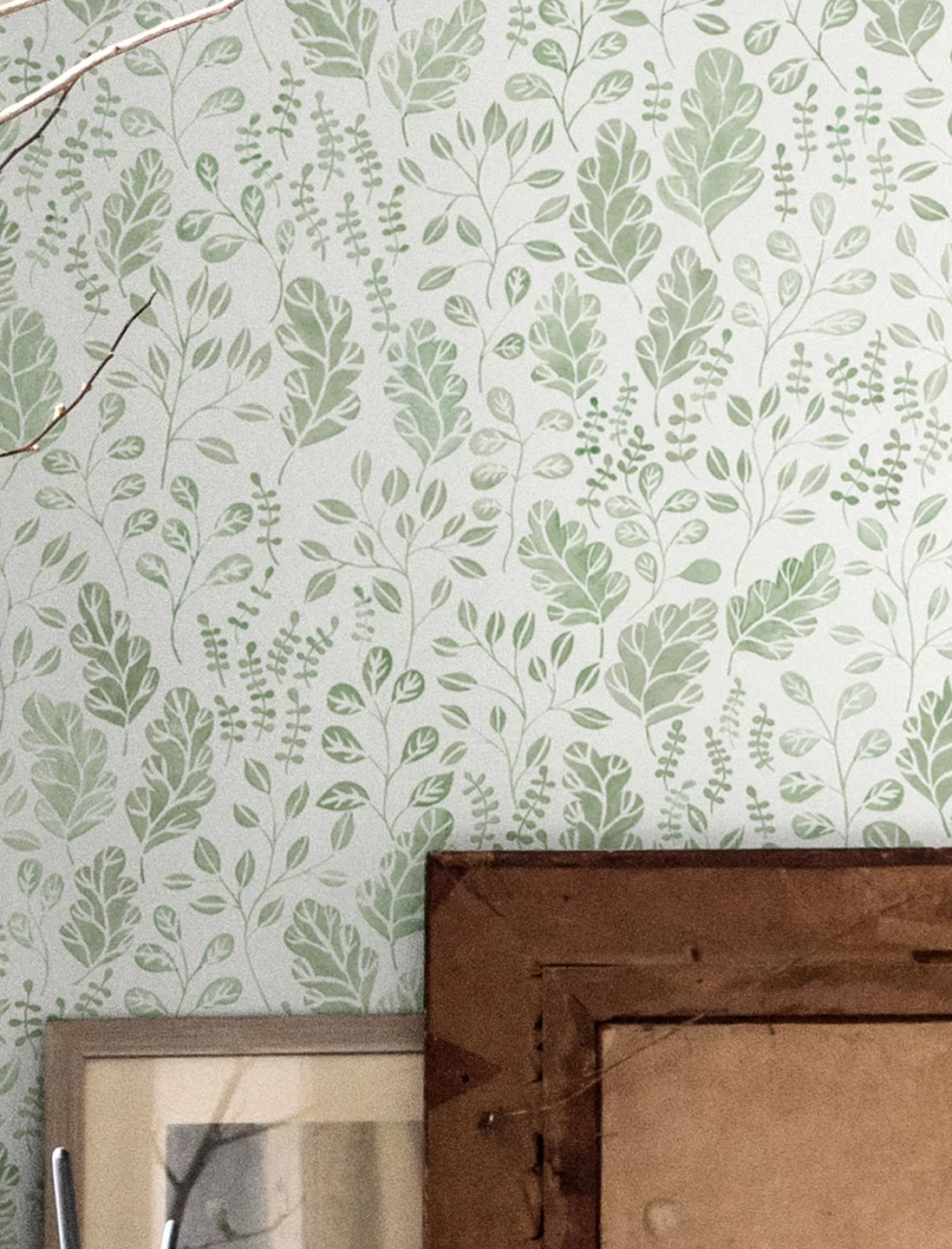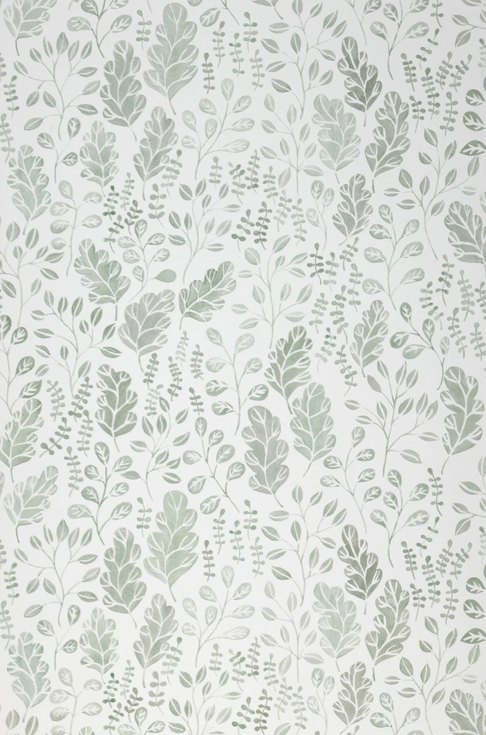 Ein zartes Muster aus stilisierten Blättern und Blattranken windet sich über die weiße Grundfläche dieser hübsch gestalteten Vliestapete. Nur aus grünen Farbflächen und den weißen Zwischenräumen entstehen die vielfältigen Blattformen mit ihren filigranen Stängeln und ihren verästelten Blattadern. Dadurch wirkt das Design wie eine kunstvolle, handwerkliche Drucktechnik, wie sie auch auf Stoffen verwendet wurde.
