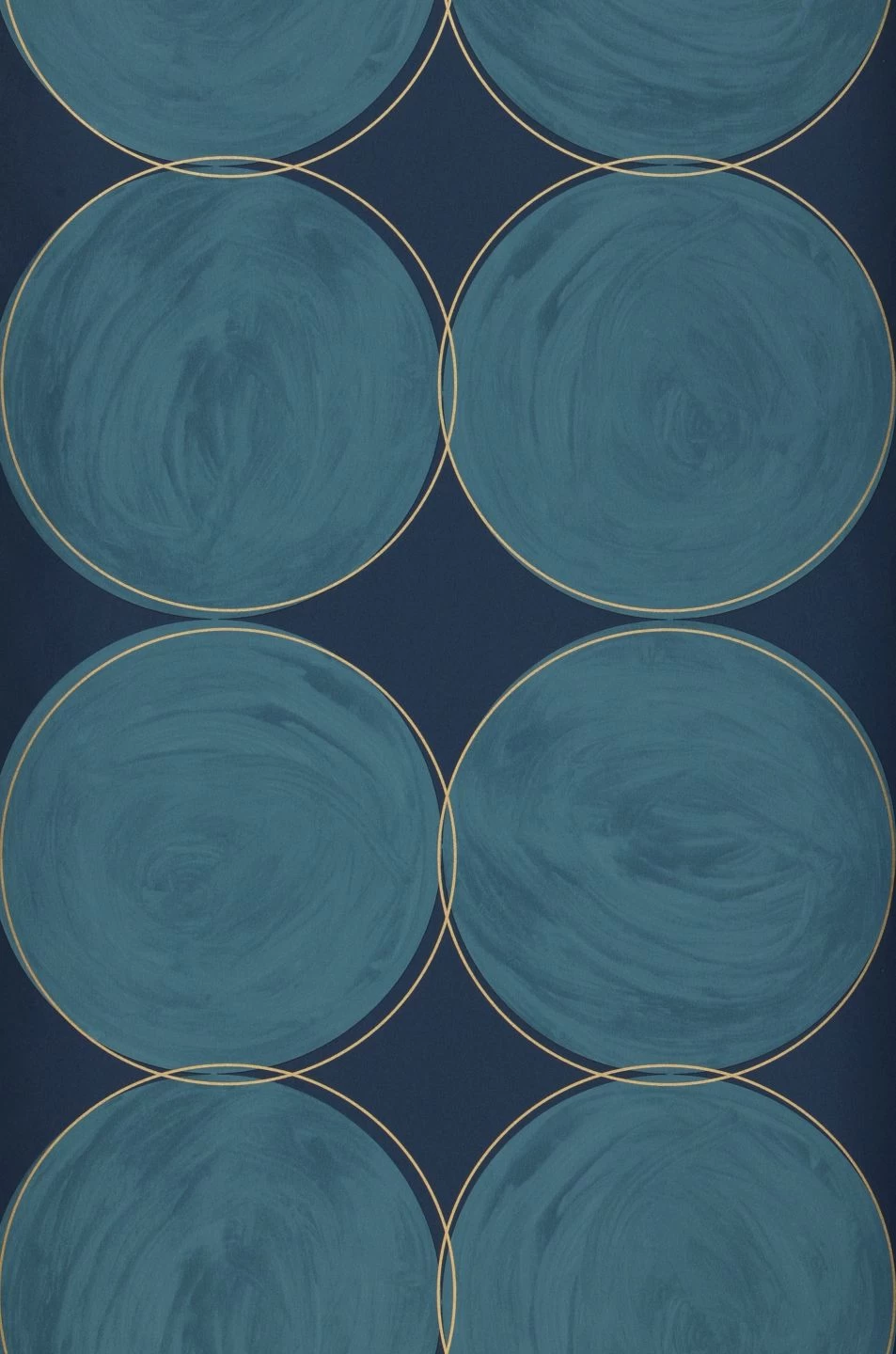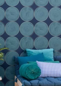 Große türkisblaue Kreise, wie von Hand mit Wasserfarben ausgemalt, deren Konturen von feinen goldfarbenen Linien umspielt werden, bilden auf dem dunkelblauen Grund von Vliestapete Rowan ein ebenso ruhiges wie ausdrucksvolles Muster. Die Blautöne kleiden ein Wohnzimmer ebenso vorteilhaft wie ein Schlafzimmer und lassen sich durch ihre unempfindliche Vinyloberfläche auch in Küche oder Bad problemlos einsetzen.