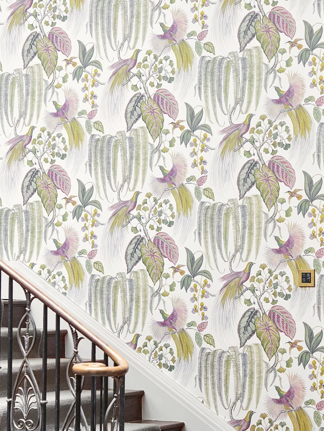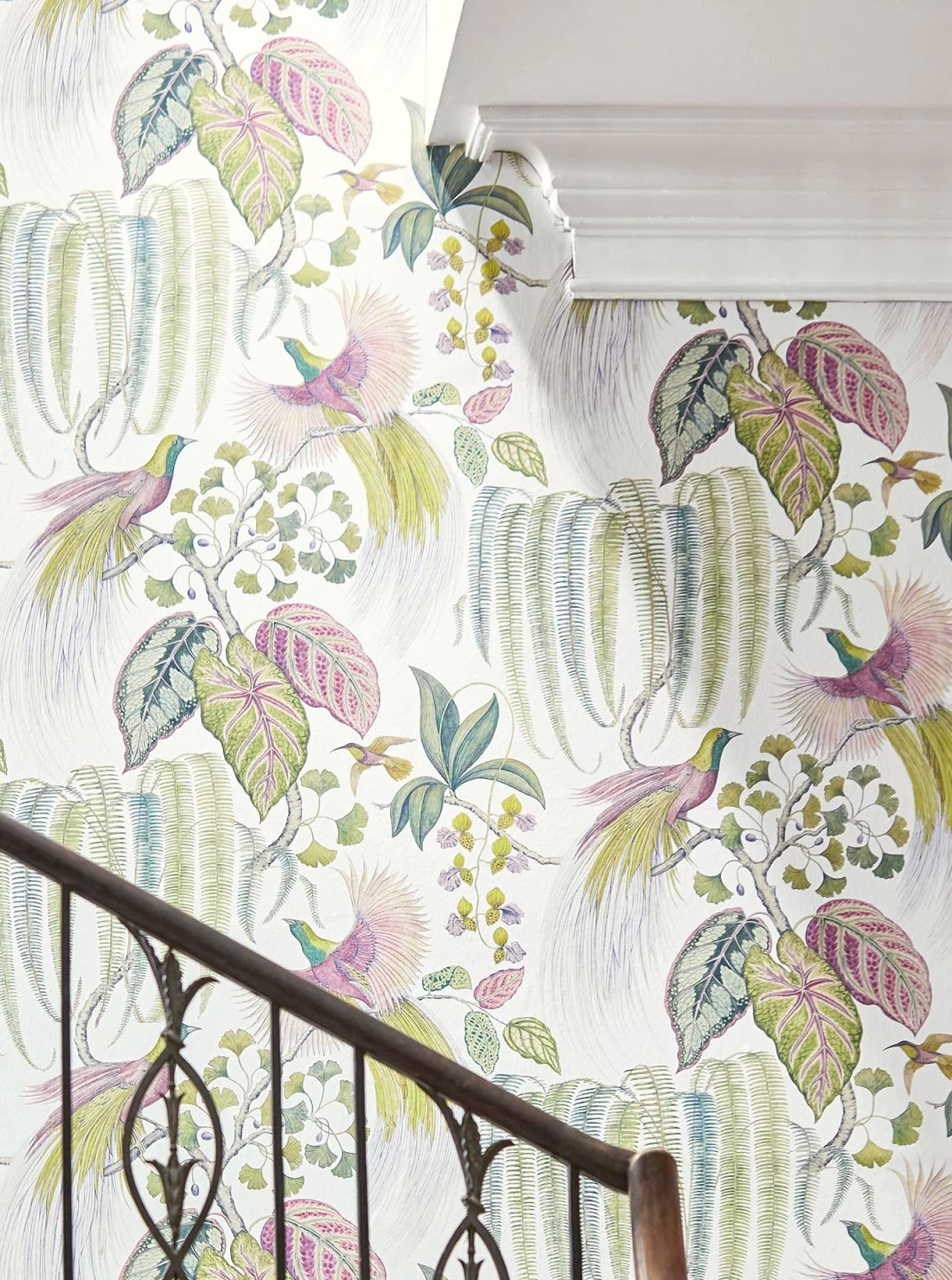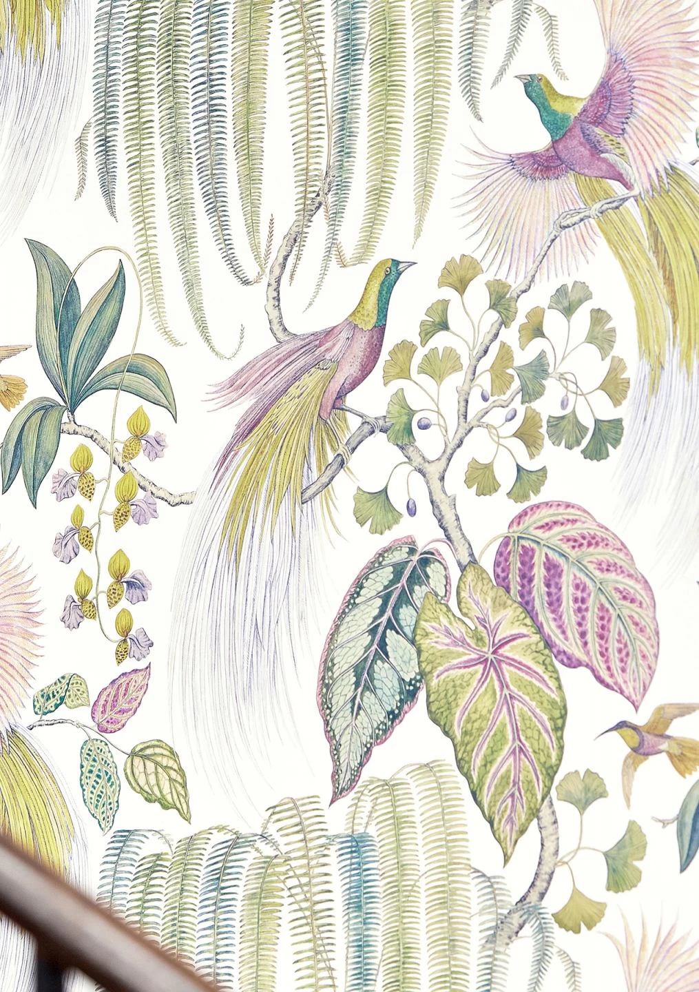 Frisch aus dem Paradies hat uns dieses extravagante Tapetenmodell erreicht. Farnbögen, Zweige, Blätter und Vögel erscheinen fantasievoll wie aus dem Reich der Träume gemalt. Das großformatige Muster beweist aus jeder Perspektive betrachtet eine ausdrucksstarke Wirkung.