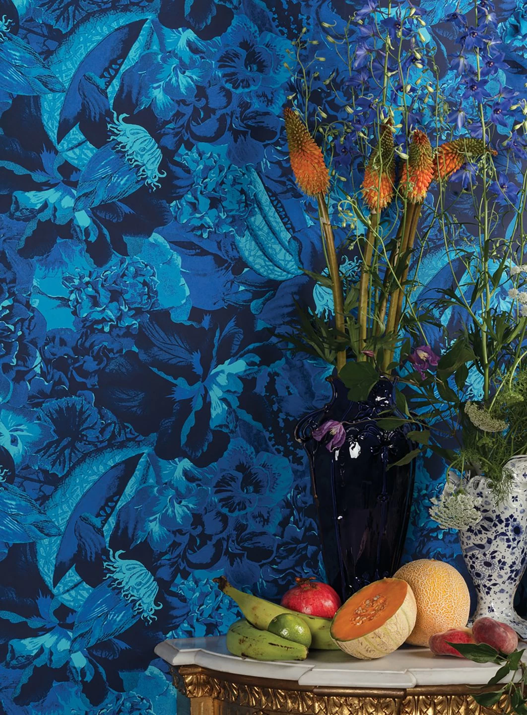 Blumentapete einmal anders: Die raumgreifenden Blüten und Blätter sind ganz in Blautöne getaucht. Die verschiedenen Helligkeitsstufen von einem zarten Hellblau bis zum tiefen Nachtblau enthüllen die feinen Details der Blütenblätter. Eine traumhafte Stimmung entsteht, die Ihren Raum fast magisch erscheinen lässt. Je nachdem, womit Sie das blaue Blütenmeer kombinieren, erzielen Sie ganz unterschiedliche Raumwirkungen.