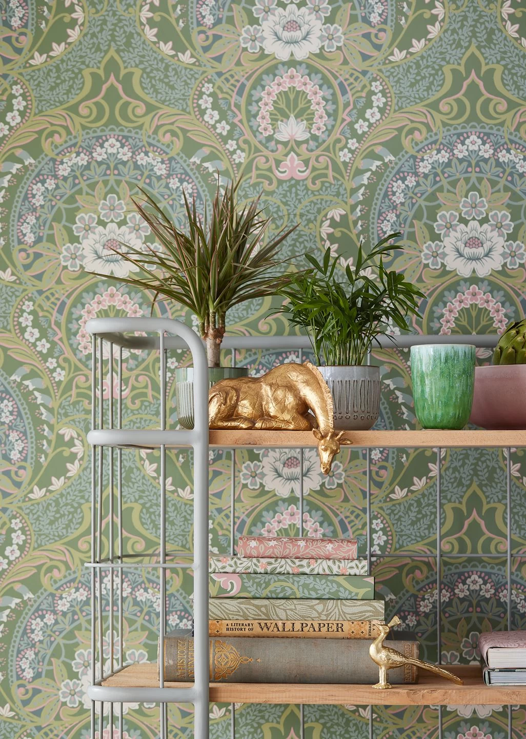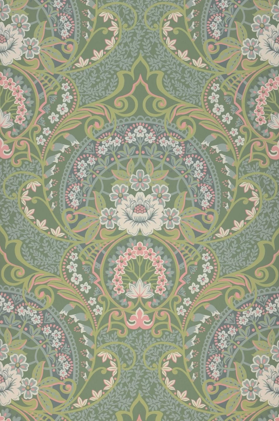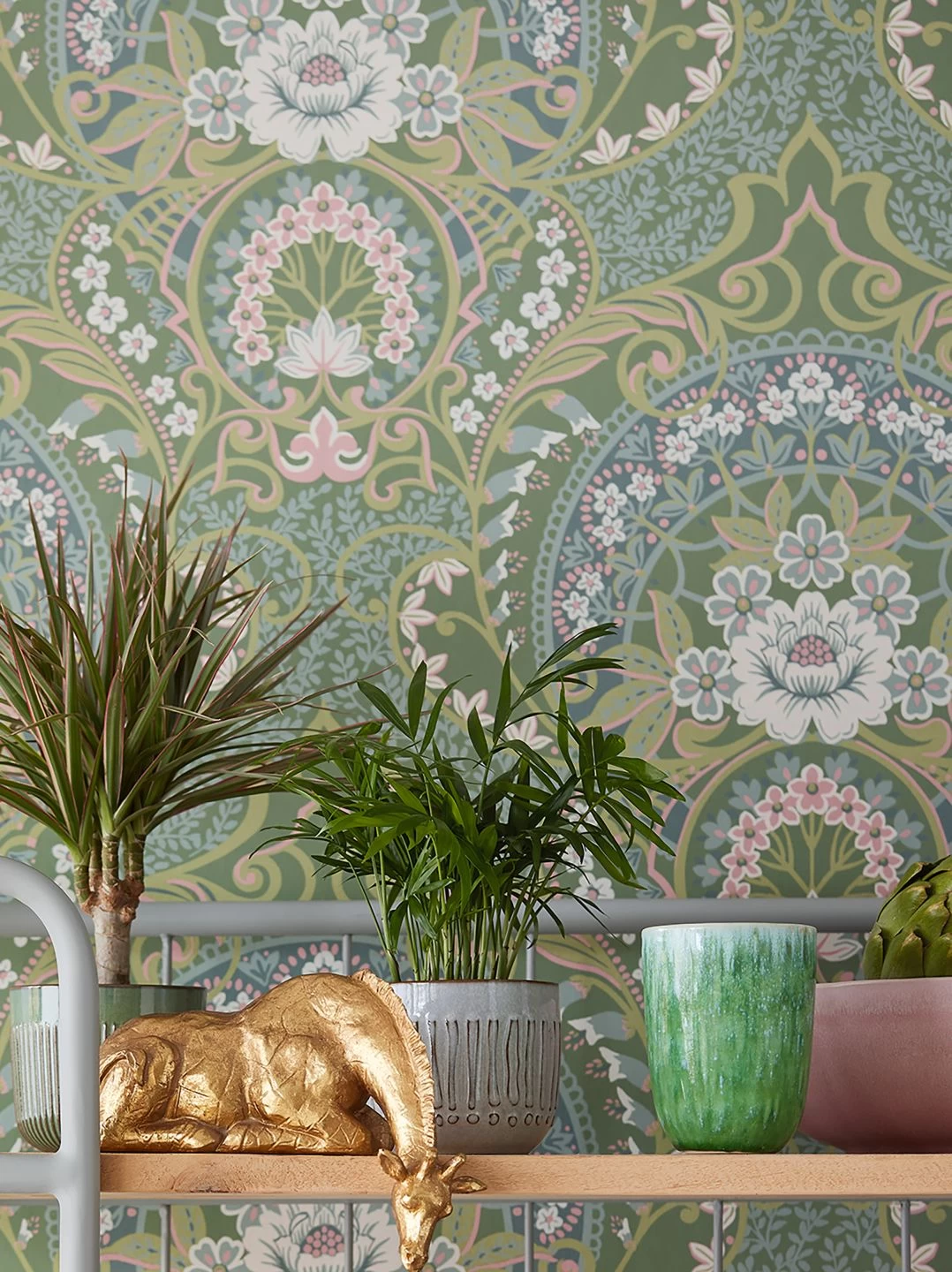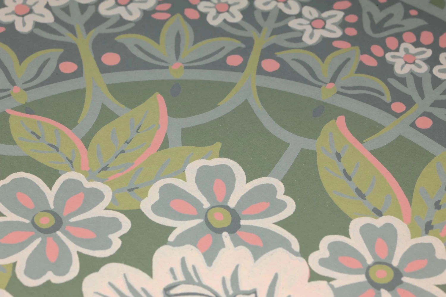 Zarte frühlingshafte Farbtöne bestimmen den Gesamteindruck von Leichtigkeit, den das klassische Tapetenmuster von Sofia ausstrahlt. Der grüne Grund mit den Ornamenten in hellen Grün- und Blautönen, Altrosa und Creme vermittelt gleichzeitig ein Gefühl von Nostalgie und Geborgenheit. Elegant geschwungene Blattranken, zierliche kleine Blüten in hellen Farben und dazu die unaufdringliche Symmetrie kleiden Ihren Raum in ein stilvolles Gewand.