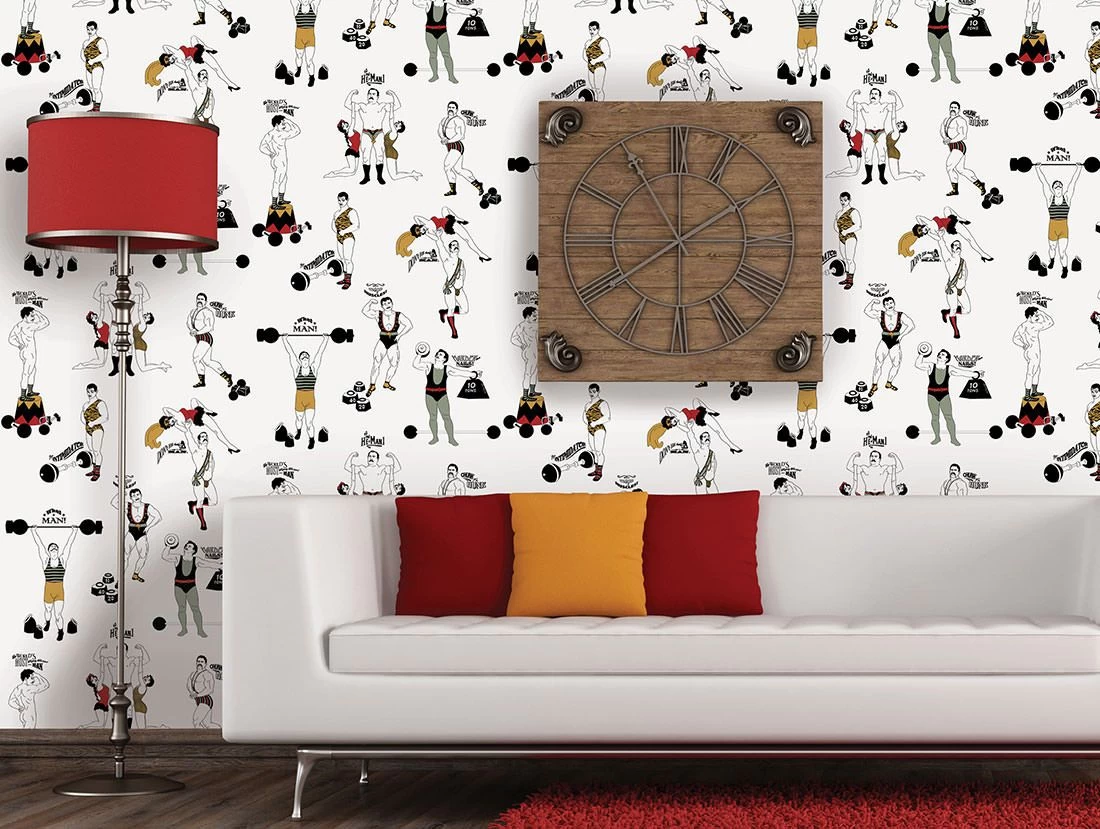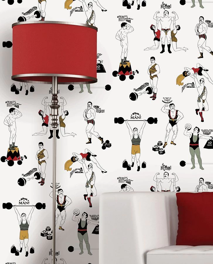 Die tollkühnen Helden in ihren historischen Sportanzügen, oder auch mal nackt wie Gott sie schuf, zeigen ihre geballte Kraft in allen Positionen und mit gekonnter Leichtigkeit. Die humorvolle Dupenny Designtapete sorgt für ein freches Grinsen und jede Menge Gesprächsstoff in alle Richtungen. Trotz optischem Nostalgie-Faktor beweist die Mustertapete jede Menge kokette Modernität.