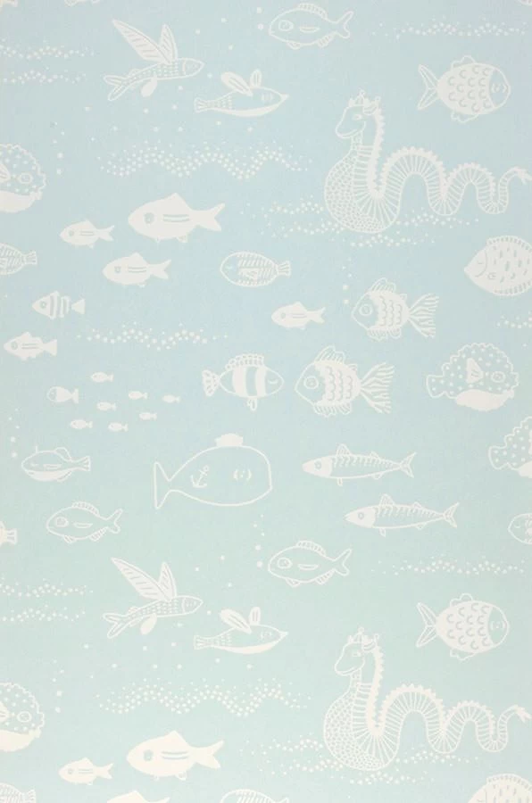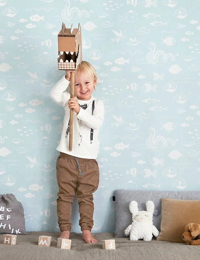 Pastelltürkis bildet das große Meer ab, in dem sich die weißen Silhouettenfische pudelwohl fühlen, wie die spritzigen Wasserbläschen beweisen. Die waschbeständige Kindertapete von Majvillan erschafft eine atmosphärisch kunstvolle Unterwasserwelt, die sich für thematische Raumgestaltung wunderbar anbietet.