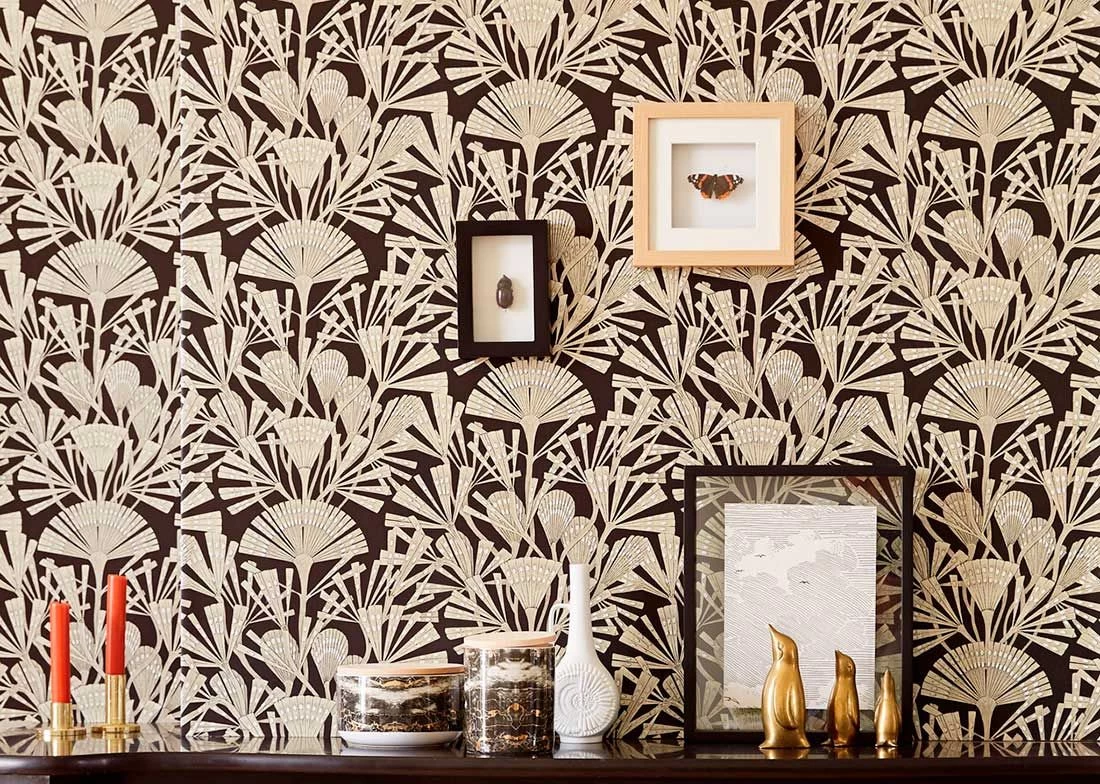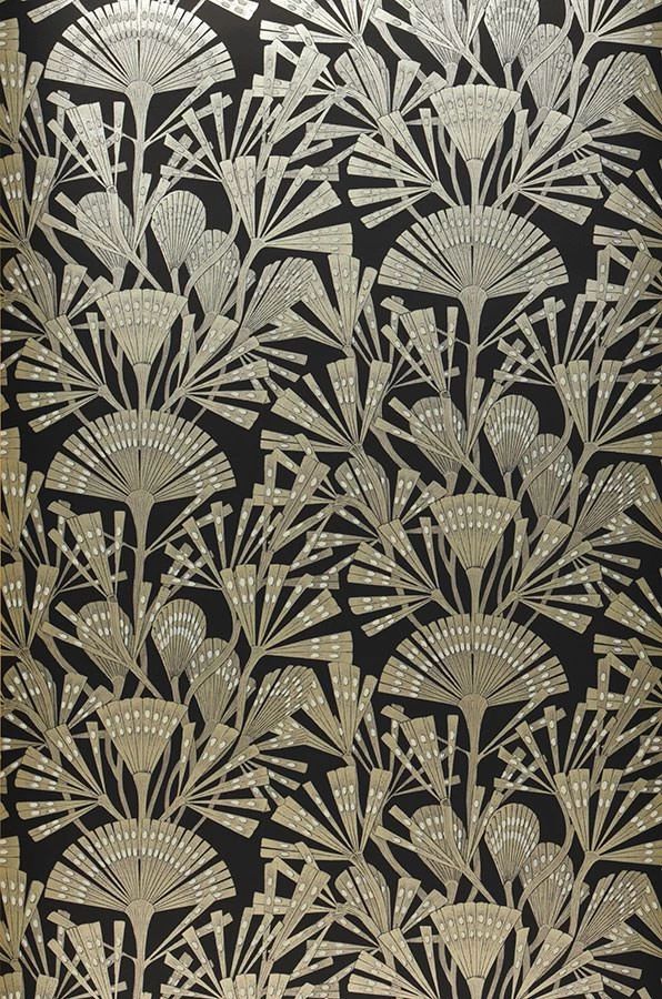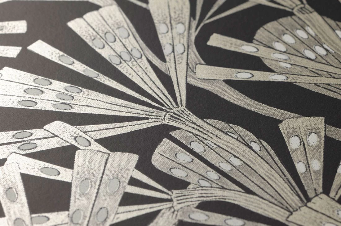 Wie ein stilvoller Mix aus Jugendstil und ägyptischer Kunst mutet die florale Mustertapete Tiberia in der Farbzusammenstellung von Schwarz, Cremeweiss und Perlbeige an. Die stilisierten Blüten schimmern sanft, was einen interessanten Kontrast zum matten Untergrund ergibt.