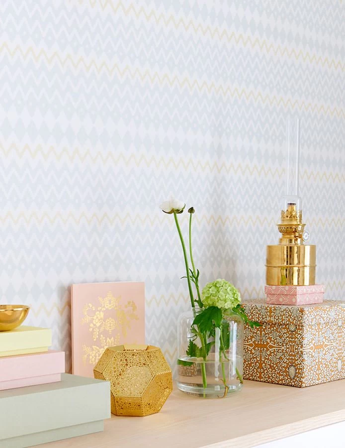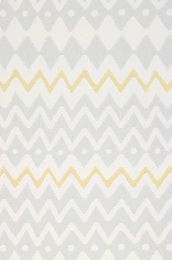 Das Zickzack-Muster in dezenten Farben erinnert an indianische Kunstwerke. Durch das Leimdruckverfahren wirken die Linien in Hellgelb und Hellgrau wie von Hand bemalt.