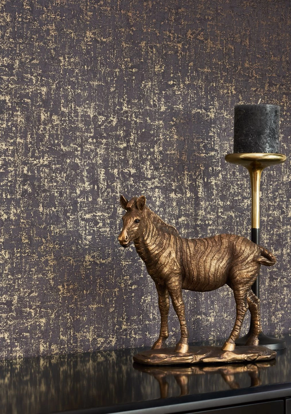 Ein verheißungsvoller goldener Schimmer liegt über der anthrazitfarbenen Grundfläche wie eine gealterte Patina. So wirkt diese außergewöhnliche Tapete gleichzeitig leicht abgenutzt und luxuriös. Die dunkle Grundfarbe erfährt durch die goldenen Strukturen leuchtende Reflexe. Im Zusammenspiel mit Licht vom Fenster oder einer künstlichen Lichtquelle entstehen schöne Effekte. Shabby Chic wird durch die besondere Ästhetik von „Trilo“ um einen Hauch von Luxus bereichert.