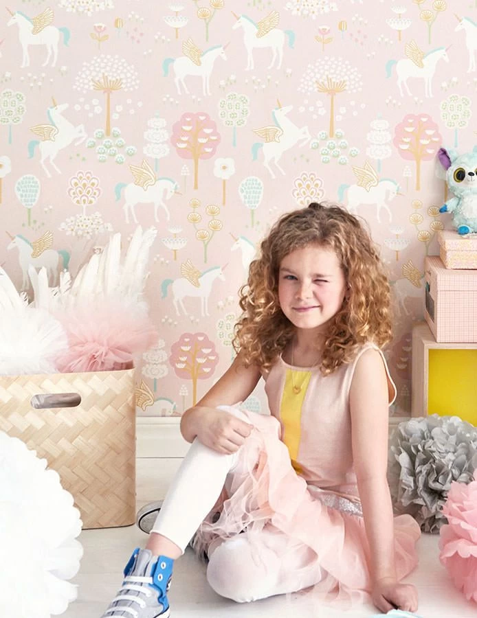 Kindertapete True Unicorns in Zartrosa mit zauberhaften Musterfarben in Cremeweiss, Gelbgrün, Minttürkis, Ocker, Rosenholz erschafft eine märchenhafte Fantasiewelt. Die weißen Einhörner mit magischen Kräften laden ein, ihre Abenteuer mitzugestalten. Die sanften Farben der Majvillan Designer Tapete wirken beruhigend und verleihen dem Mädchenzimmer fabelhafte Romantik.