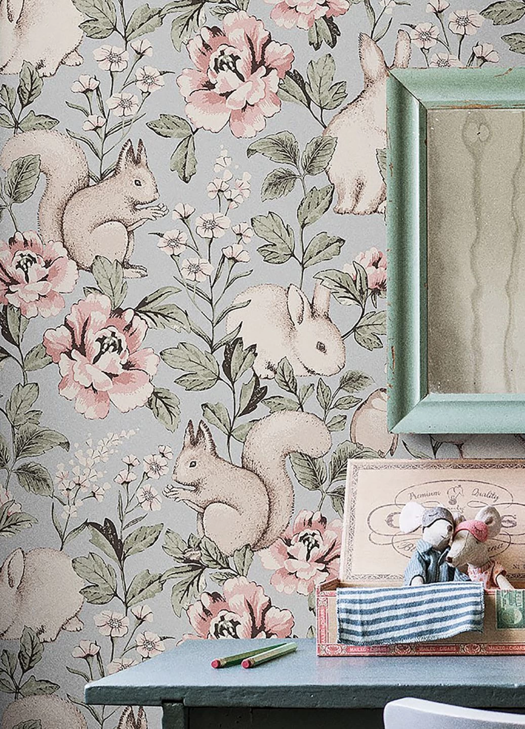 Romantisch und verspielt wirkt die Vliestapete „Twiggy“ mit den niedlichen Kaninchen, Eichhörnchen und Singvögeln inmitten von zarten Blumen. Auf dem hellgrauen Untergrund entfalten die Pastellfarben ihre ganze Wirkung. Cremeweiß und Rosenholz, Blassgrün und Weißbraun sorgen für Helligkeit und Freundlichkeit. So bildet die Tapete eine wunderschöne Kulisse gerade für ein Kinder- oder Jugendzimmer.