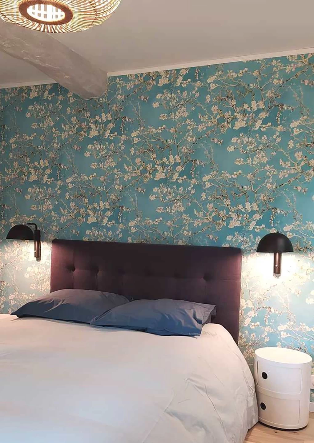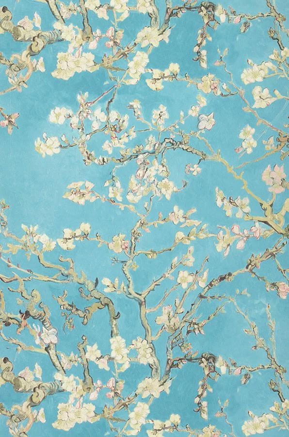 Inspiriert von den Gemälden Vincent van Goghs, zeigt die Vliestapete Mandelzweige voller zarter Blüten auf strahlend türkisfarbenem Grund, so als würde man durch die Zweige hindurch den wolkenlosen Sommerhimmel sehen. Die kräftigen Pinselstriche van Goghs sind in der Vinyloberfläche fühlbar. Gleichzeitig sorgt das hoch waschbeständige Oberflächenmaterial dafür, dass Sie die Tapete selbst in einem Badezimmer einsetzen können.