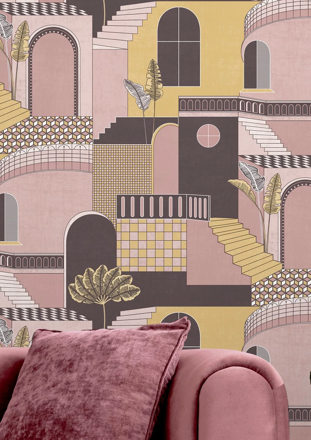 Märchenhaft orientalisches Flair zieht mit der Art-Deco-Papiertapete Verney bei Ihnen ein. Aus geometrischen Formen setzt sich eine Stadt zusammen, komplett mit Häusern und Torbögen, Treppen, Fenstern und Balkonen. Die Rosa- und Sandgelbtöne in Verbindung mit Schwarz und Weiß bilden eine Vielfalt von Kachelmustern, die die einzelnen Häuser voneinander unterscheiden. Wenn Sie die Themenwelt Orient in Ihrer Einrichtung aufgreifen, schaffen Sie ein stimmiges und stimmungsvolles Ambiente.