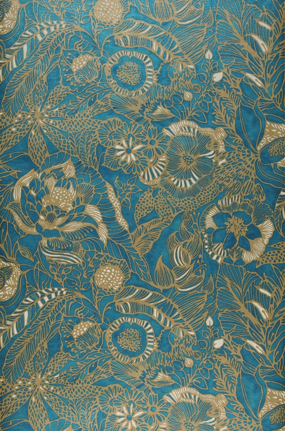Ein dichter Dschungel von üppigen Blüten und Blättern entsteht allein durch mattgoldene, teilweise mit Cremeweiß gefüllte Umrisse auf dem leicht schimmernden, fein strukturierten Untergrund in leuchtendem Wasserblau. Die Lebenskraft und die überbordende Fülle und Formenvielfalt der Blumen beleben Ihre Wand mit der eleganten Kombination aus Gold und Blau. Helle Holzfarben oder weiße Möbel ergeben ein freundliches, stimmiges Ensemble.