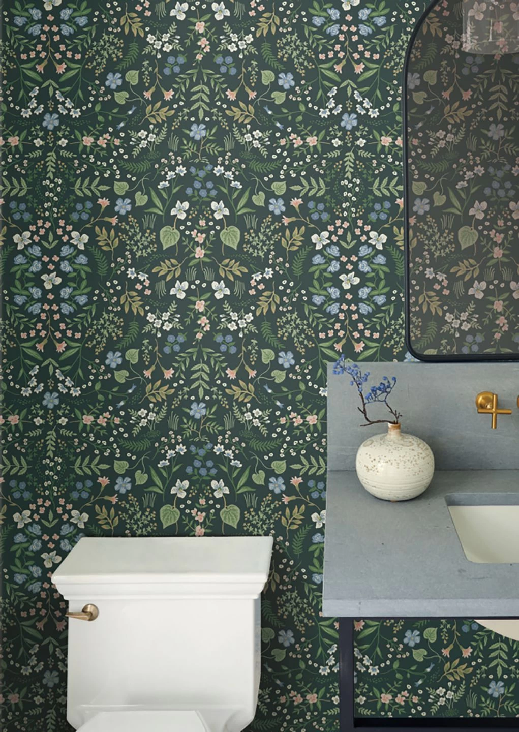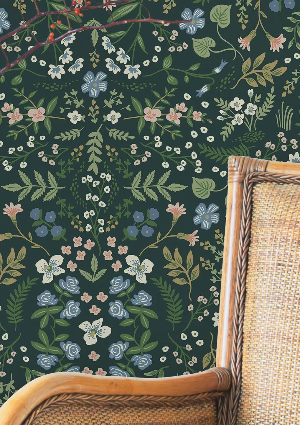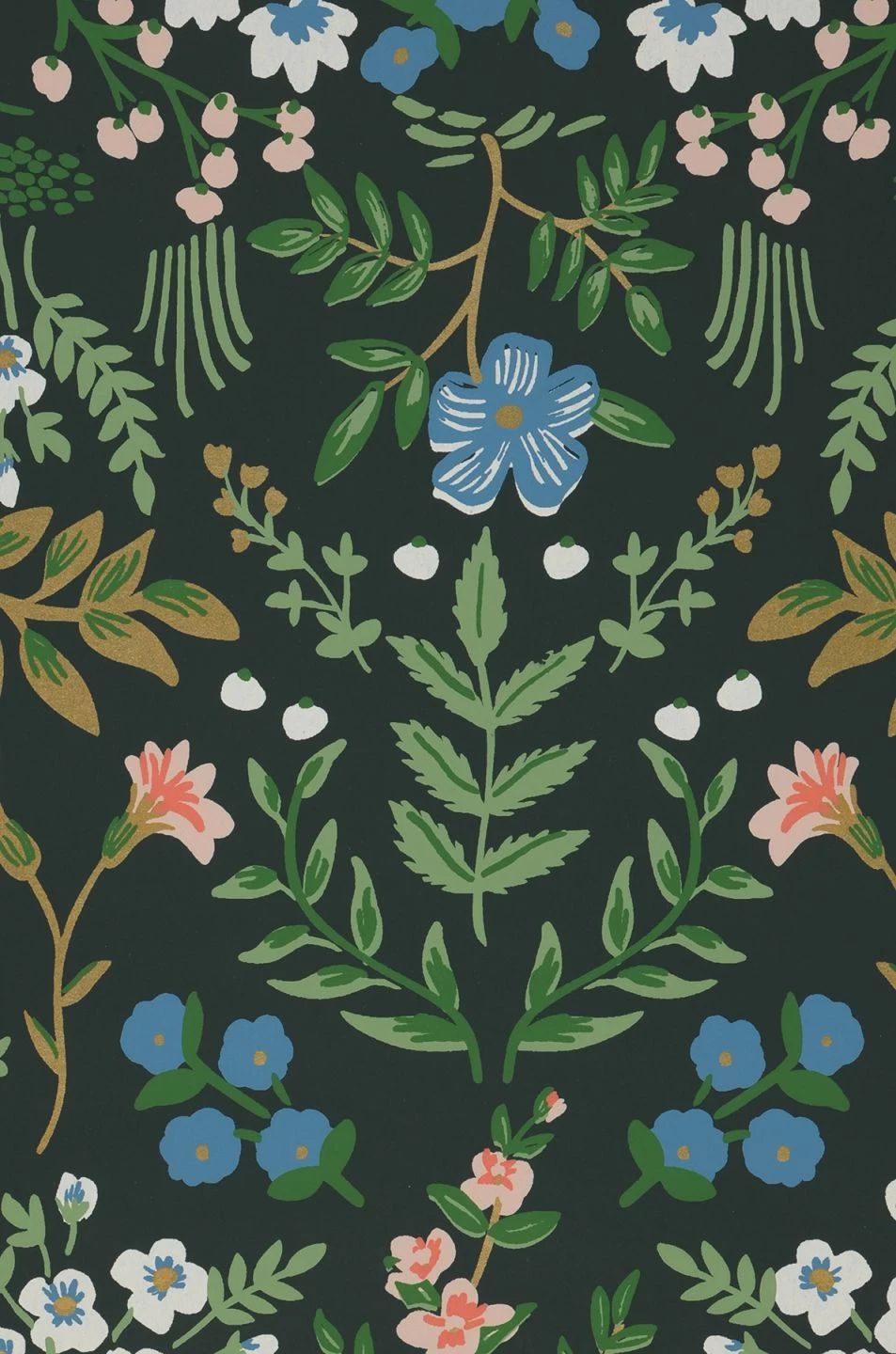 Durch den tannengrünen Untergrund der Vliestapete wirken die Blumen in ihren hellen, freundlichen Farben mit goldfarbenen Details wie Frühlingsblumen auf weichem, moosigem Waldboden. Die Darstellung der Blüten und Blätter erinnert an Ornamente aus der Bauernmalerei, wirkt aber gleichzeitig durch die willkürlich anmutende Verteilung wie natürlich gewachsen. Die Tapete harmoniert ideal mit einer Vielzahl von Möbelstilen.