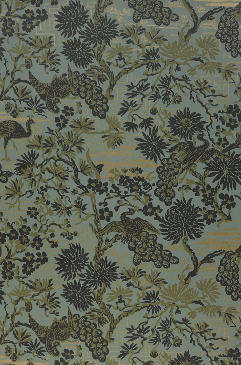 Harmonisierende Farben wie Mintgrau, Grauoliv, Mattgold und Schilfgrün verströmen das Flair eines asiatischen Sonnenuntergangs inmitten einer blühenden Pracht. Ob Sie Räume im Asia-Look gestalten oder ein Stück vom romantischen Glück genießen wollen – Mit der floralen Mustertapete gelingt Ihnen alles.