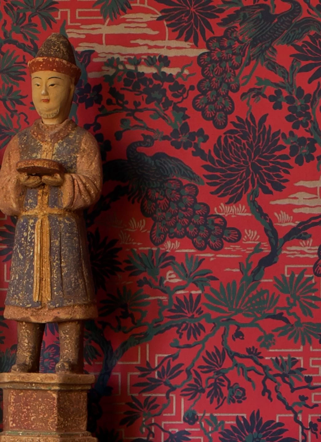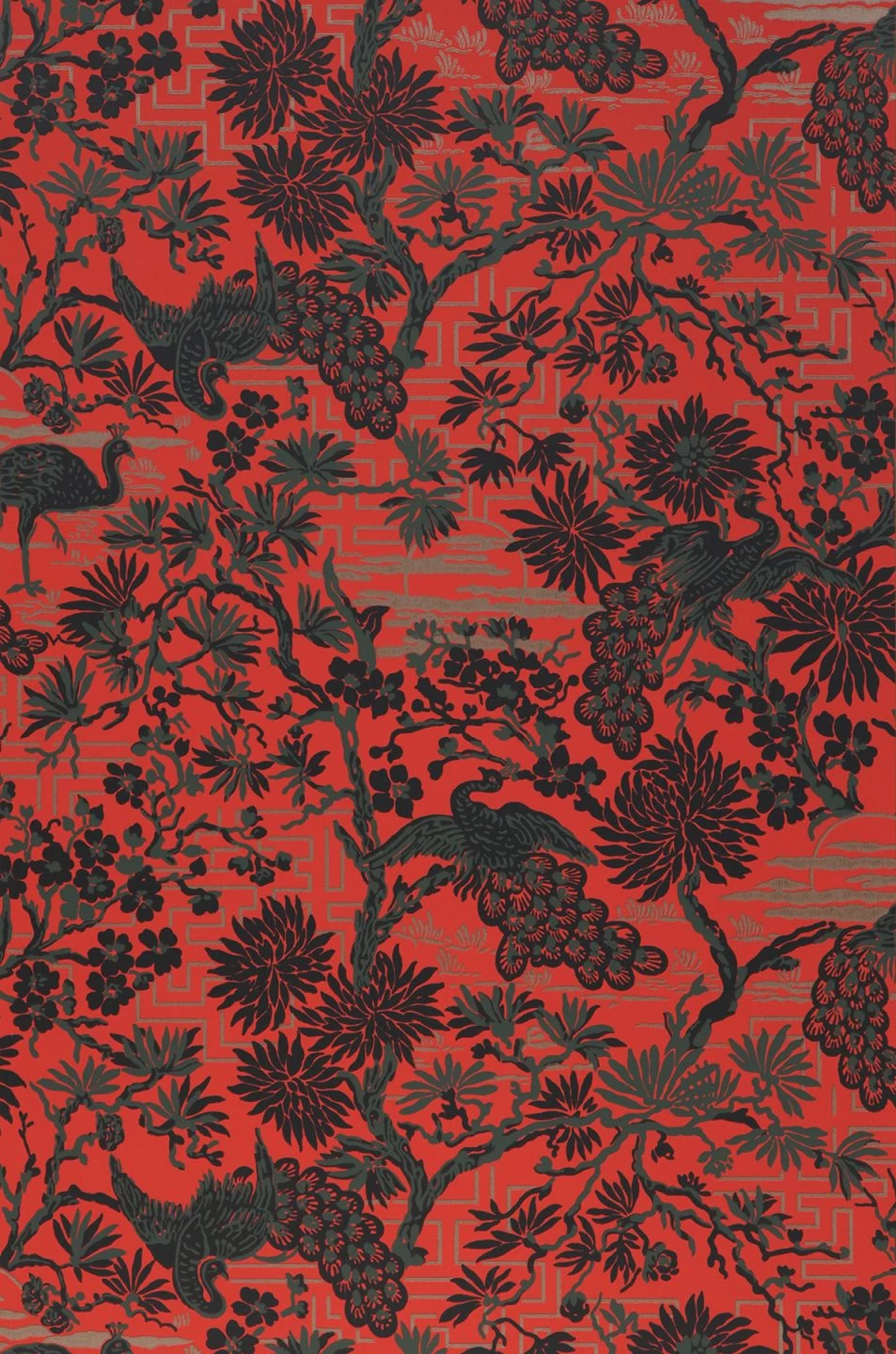 Die magische Schönheit Asiens drückt sich mit diesem reizvollen Mustermotiv in Grüngau, Perlbeige, Schwarz auf leuchtend orientrotem Fond aus. Träumen Sie mit und gestalten Sie Themenräume privat oder geschäftlich mit dieser romantischen Designtapete. Die in Leimdruck gehaltene Optik verleiht der Papiertapete einen edlen Charakter.