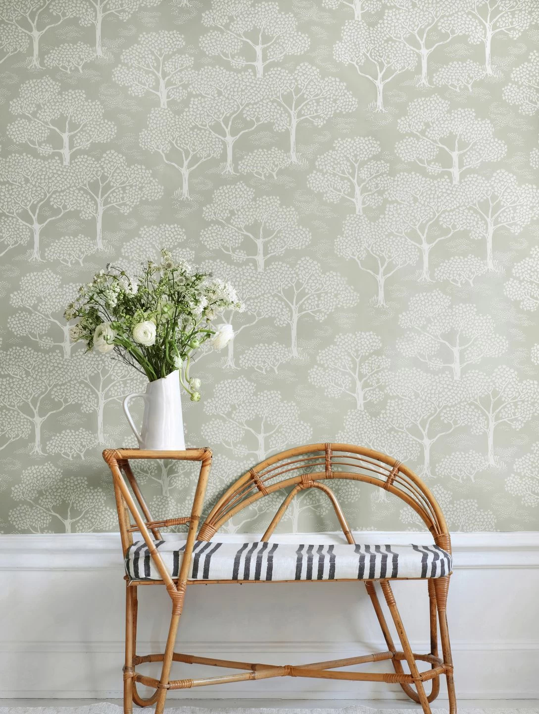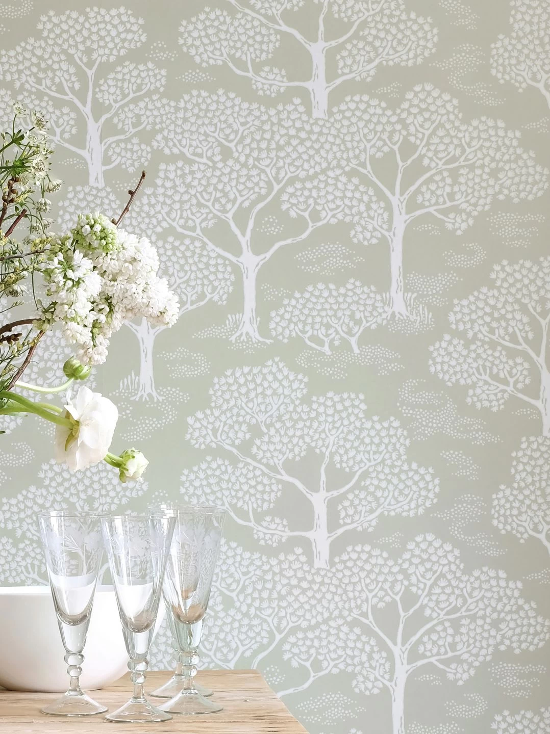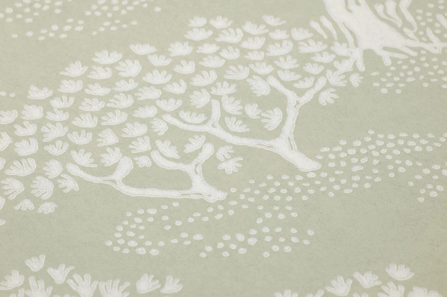 Ein lieblicher, frühlingshafter Laubwald, der Waldboden übersät von weißen Blütentupfen wie in der Blütezeit der Buschwindröschen – Woodland erinnert an einen erholsamen Waldspaziergang im Frühjahr. Das helle Schilfgrün und das Cremeweiß des Musters finden sich zusammen zu einer zurückhaltenden, aber dennoch präsenten Ästhetik, mit der Sie Ihre Küche, Ihr Schlafzimmer oder auch Ihr Büro wirkungsvoll dekorieren.