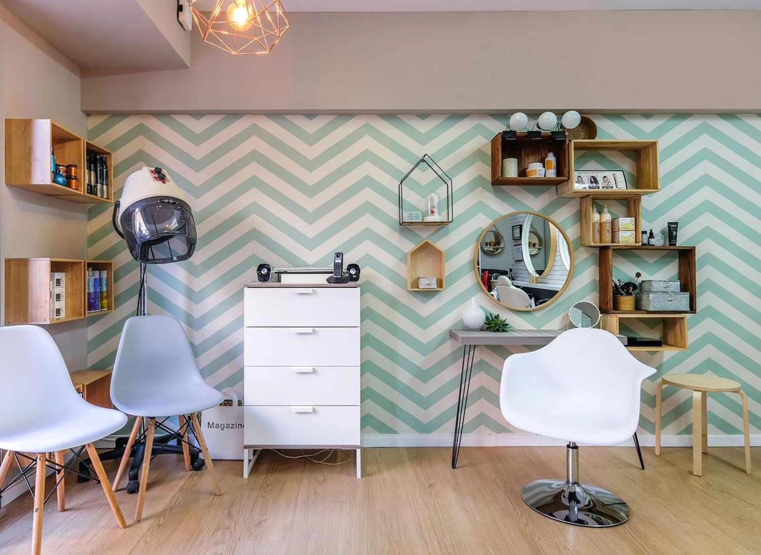 Das zackige Grundelement ist altbewährt und gefragt. Hier kommt es in Pastellgrün und verschönert Küchen genauso wie Schlafstuben oder Esszimmer.