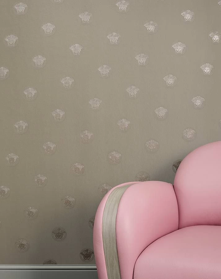Der Medusenkopf – Das Markensymbol von Versace bildet auf der erlesenen Designer Tapete das prägende Muster. Das Ornament mit der mystischen wie tragischen Figur der griechischen Mythologie hebt sich als fühlbares Relief vom schimmernden Untergrund ab und eröffnet je nach Lichteinfall zwei Gesichter als Positiv oder Negativ. Fantastich geheimnisvoll und edel zugleich.