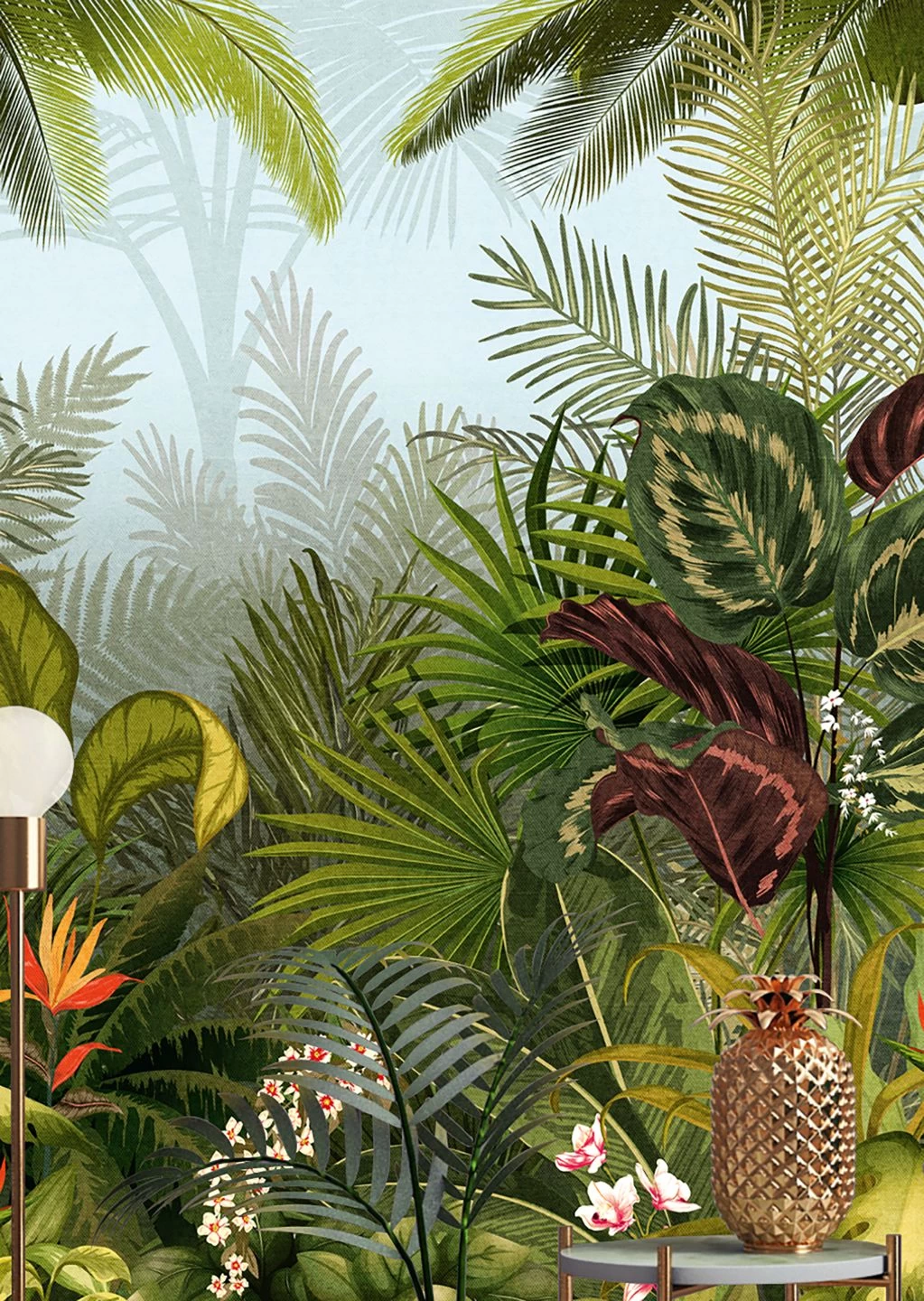 Das dreiteilige Wandbild Jungle Kingdom schmückt Ihre Wand mit einem Dschungel aus Palmen, tropischen Blattpflanzen und farbenprächtigen Blüten. Über das undurchdringliche Unterholz hinweg schweift der Blick in die Ferne zu nebelverhangenen Bäumen. Krönen Sie die Wirkung Ihrer Wand mit dem Jungle Kingdom als Highlight oder erweitern Sie das Wandbild mit dem gleichen Motiv beliebig. Die Vinyloberfläche ermöglicht Ihnen, das Wandbild sogar im Bad problemlos einzusetzen.