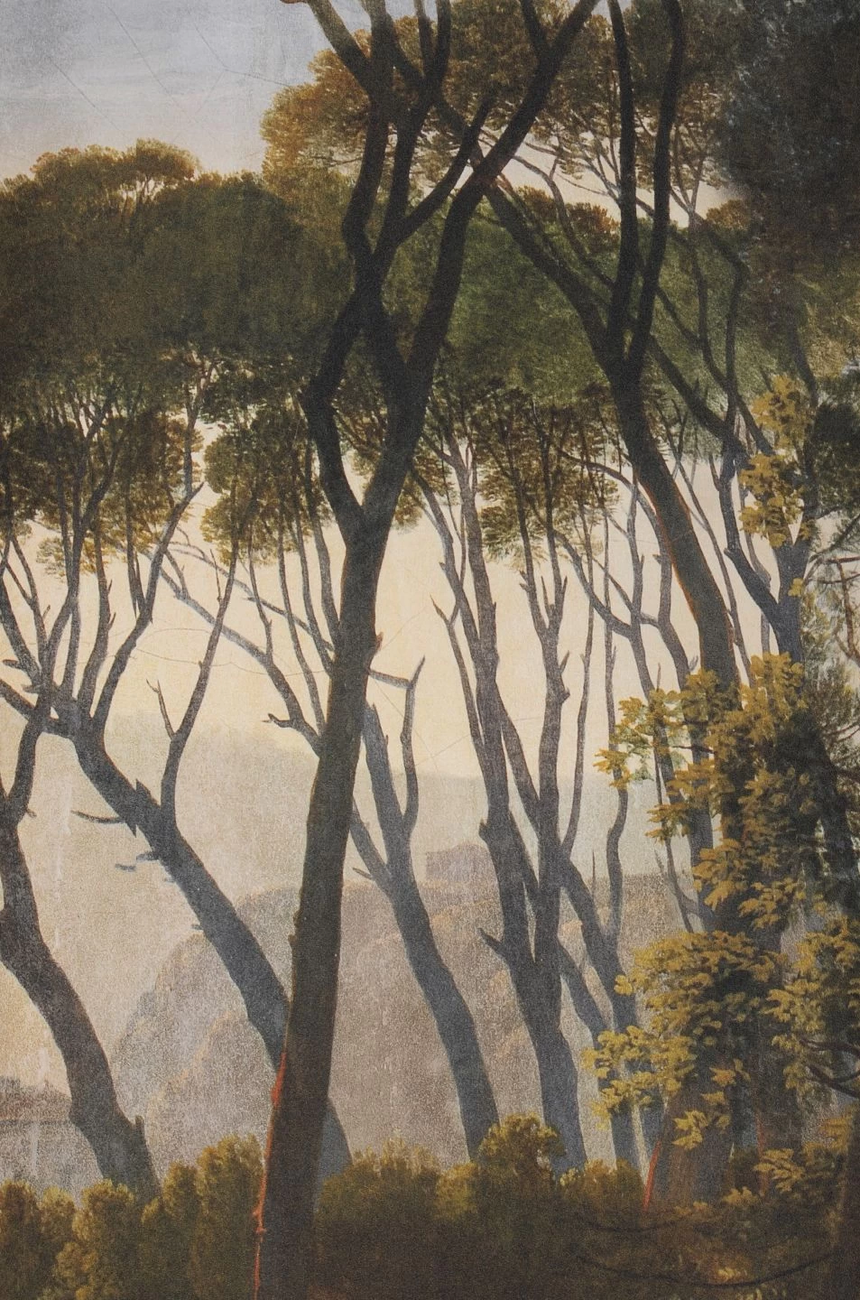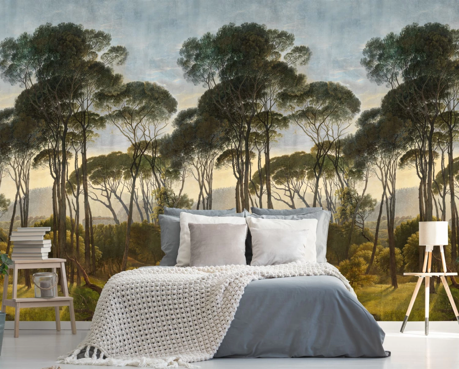 Eine romantische Landschaft wie auf einem Gemälde öffnet Ihren Raum und scheint das Sonnenlicht hineinzulassen, das zwischen den hoch gewachsenen Pinien auf dem Gras spielt. In der Ferne erahnt man die Weite der malerischen Szenerie. Das Wandbild besteht aus drei Teilen, die Sie mit dem gleichen Motiv beliebig erweitern können. Ob ein Wohnzimmer mit klassischen Möbeln, ein Schlafzimmer oder – dank der hoch waschbeständigen Vinyloberfläche – ein Bad, Pine Trees gibt Ihrem Raum eine ausgefallene Wirkung.